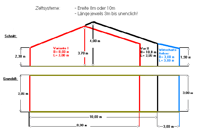 In verschiedenen Farben markiert finden Sie anbei die verschiedenen Maße der Zeltsysteme.